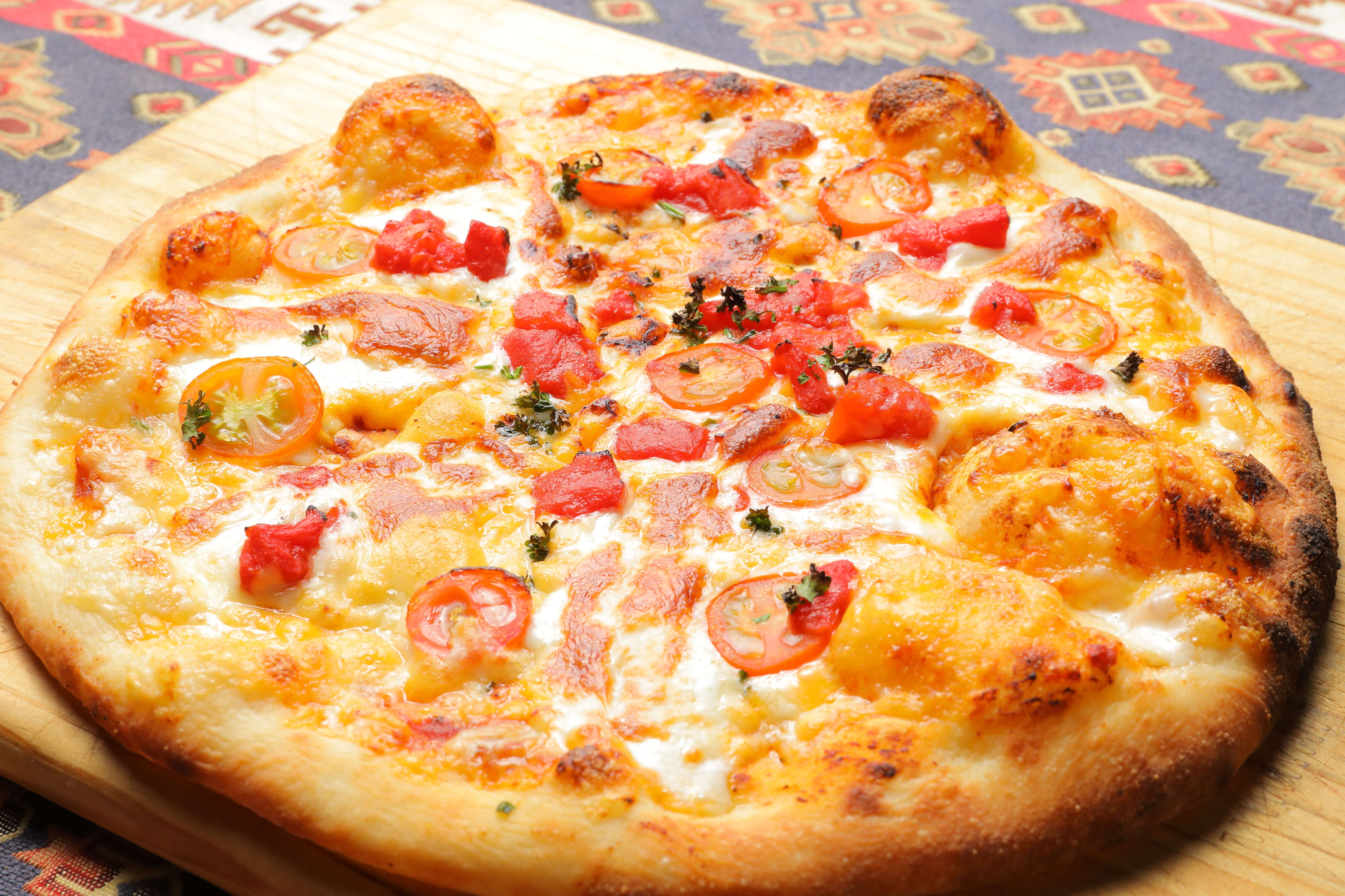 Mサイズ25cm Lサイズ30cmトマトの酸味とガーリックの香りが食欲をそそります。(ガーリック、トマト、マヨネーズ、チーズ2種)M size 25cm L size 30cm The sourness of tomatoes and the scent of garlic will whet your appetite. (garlic, tomato, mayonnaise, 2 types of cheese)