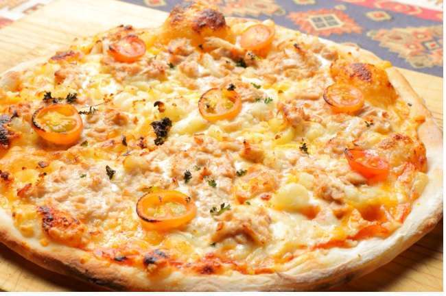 肉好きの方におすすめ!チキンソーセージがふんだんに乗ったピザです。(ポテト、トマト、ピーマン、オニオン、マヨネーズ、チーズ2種)Recommended for meat lovers! A pizza topped with plenty of chicken sausage. (Potato, tomato, green pepper, onion, mayonnaise, 2 types of cheese) (used halal chicken sausage)