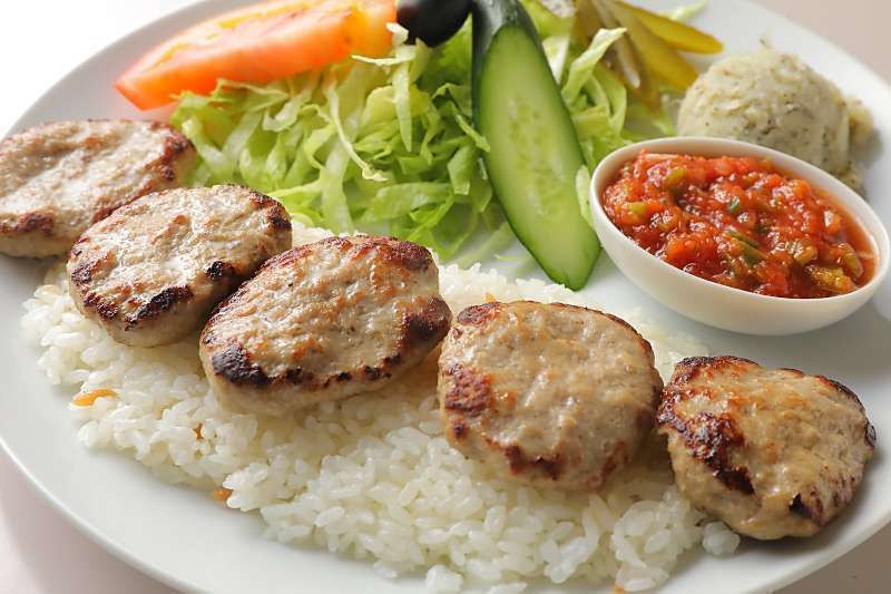 スパイシーなラム肉のハンバーグ。ラム肉が苦手な方でもクセがなく食べやすいケバブのひとつ。ラムハンバーグ・ライス250g・野菜サラダ・ピリ辛トマトの前菜・ポテトサラダのセットプレートです。Spicy lamb hamburger. This is one of the kebab that is easy to eat and has no taste even if you don\'t like lamb meat.Ram hamburger, rice 250gr, salad, spicy tomato appetizer,and potato salad.
