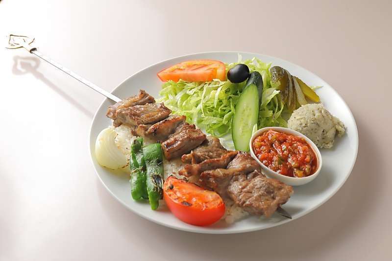 スパイスを使用しラムを串に刺してグリルした人気のメニュー。ラムシシケバブ・・ライス250g・野菜サラダ・ピリ辛トマトの前菜・ポテトサラダのセットプレートです。A popular menu item that uses spices and grills lamb on skewers. A set plate with lamb shish kebab, rice 250gr, salad, spicy tomato appetizer,and potato salad set plate.