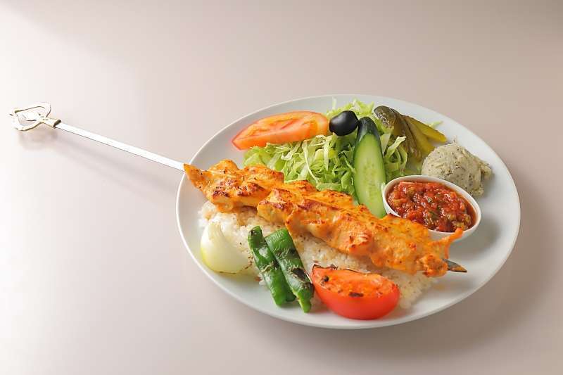 スパイスを使用しチキンを串に刺してグリルしたトルコの居酒屋でよく好まれるメニューのひとつ。rnチキンシシケバブ・ライス250gr・サラダ・ポテトサラダのセットプレートです。This is one of the favorite dishes at Turkish bars, where chicken is skewered and grilled using spices.Set plate of chicken shish kebab, rice 250gr, salad, spicy tomato appetizer,and potato salad .
