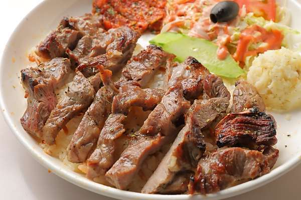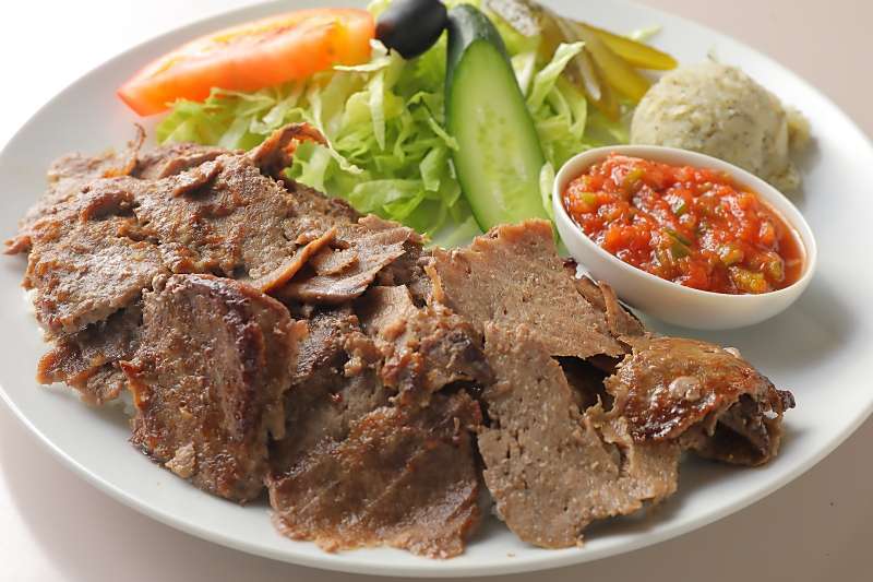 ドネルケバブプレートはジューシーな(100%beef)専用焼機で焼き上げたケバブ・ライス250gr・サラダ・ピリ辛トマトの前菜・ポテトサラダのセットプレートです。Doner Kebab Plate is a juicy (100% beef) kebab baked in a special grilling machine, rice 250gr, salad, spicy tomato appetizer,and potato salad set plate.