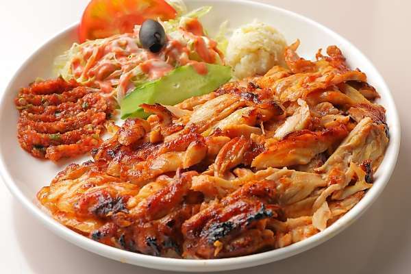 ドネルケバブプレートはジューシーな(チキン)専用焼機で焼き上げたケバブ・ライス250g・野菜サラダ・ピリ辛トマトの前菜・ポテトサラダのセットプレートです。Doner Kebab Plate is a set plate that includes juicy (chicken) kebab baked in a special grilling machine, rice 250gr, salad,spicy tomato appetizer. and potato salad.