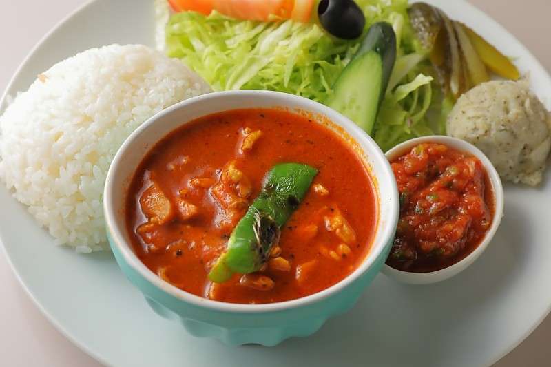 トマトベースのチキンケバブをたくさん使った当店オリジナルのカレー。ほどよくスパイシー。チキンケバブカレー・ライス250gr・サラダ・ポテトサラダのセットプレートです。Our original curry made with lots of tomato-based chicken kebabs. Moderately spicy. A set plate with chicken kebab curry, rice 250g, salad, and potato salad.