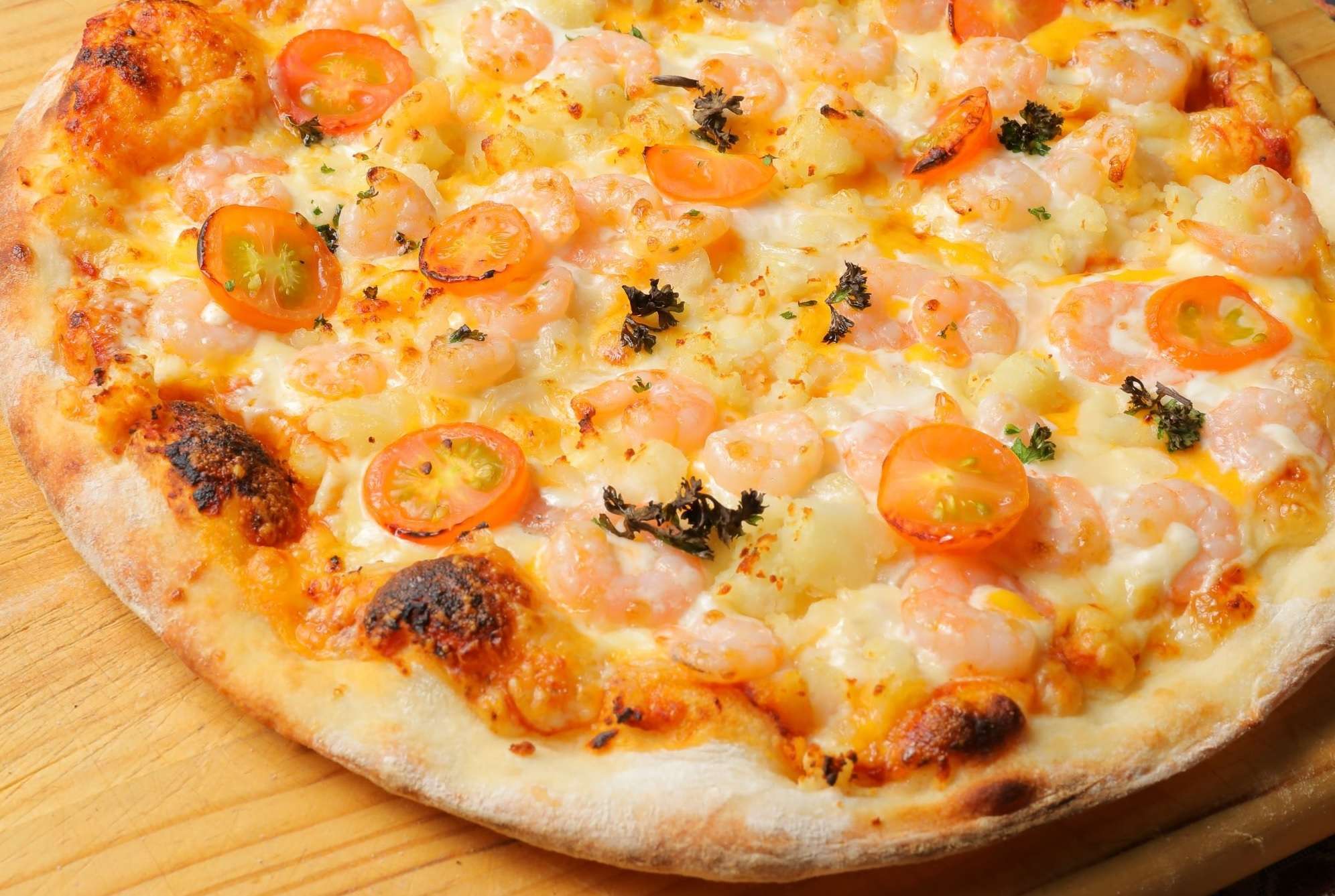 エビ×マヨネーズ×ポテトのコラボレーションをお楽しみください。(エビ、ポテト、トマト、ピーマン、オニオン、マヨネーズ、チーズ2種)Enjoy the collaboration of shrimp, mayonnaise, and potato. (Shrimp, potato, tomato, green pepper, onion, mayonnaise, 2 types of cheese)