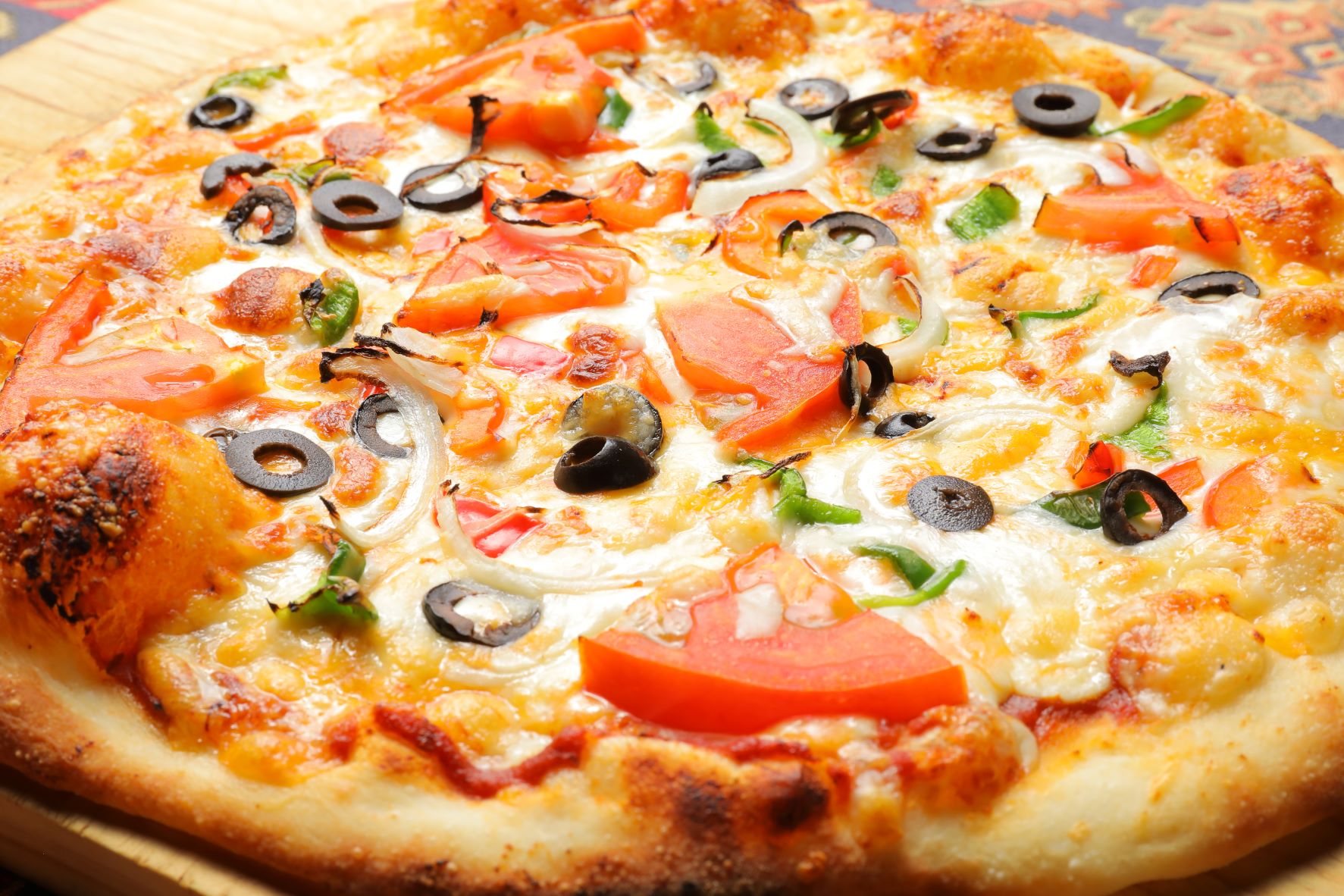 野菜をふんだんに使ったピザです。(ポテト、トマト、ピーマン、オニオン、マヨネーズ、ブラックオリーブ、チーズ2種)A pizza made with plenty of vegetables. (Potato, tomato, green pepper, onion, mayonnaise, black olive, 2 types of cheese)